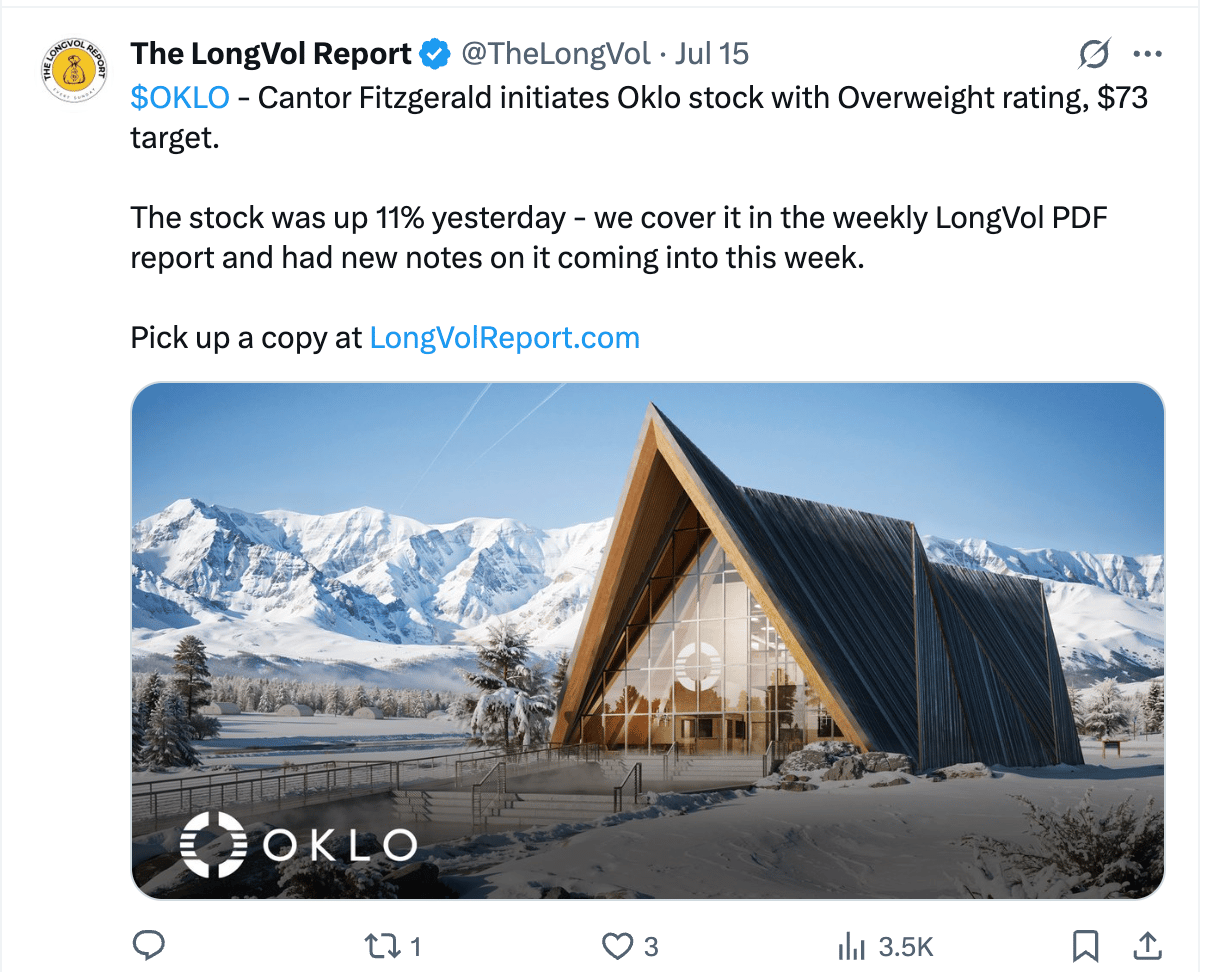 $OKLO ( ▲ 0.77% ) - This was in play this week and is in the report. We had a big day Tuesday followed by a check back Wednesday. Readers cashed in and continue to do so here trading the momentum.