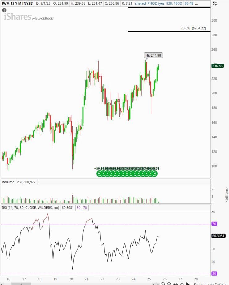 The Russell 2000 $IWM ( ▲ 0.31% ) ETF looks poised to want to attack new highs as we approach $244 and the divergence on RSI reading for this compared to the $SPY ( ▼ 0.5% ) is something of interest to me hence my views on owning select small and mid caps.