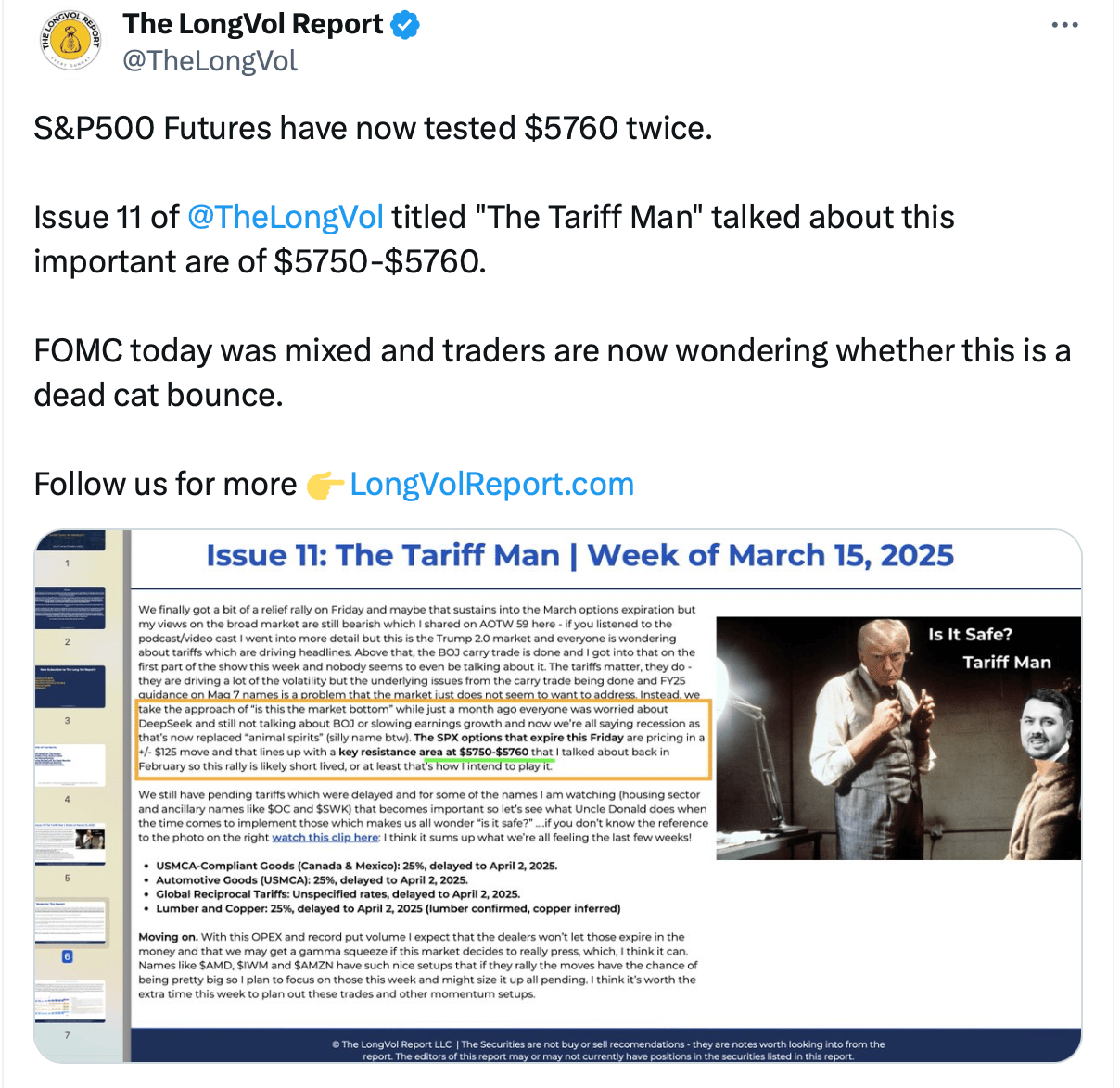 SP500 $5760-$5770 Resistance/Target: For those paying attention, we talked about this area on the SP500 futures in the Sunday PDF report titled: “The Tariff Man”.