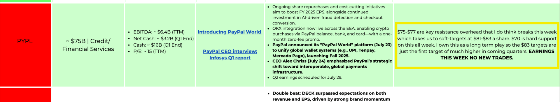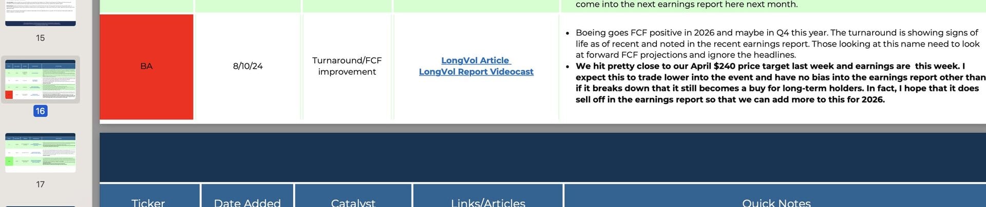 I am going to go over why I got short Boeing but still want to be long it near $200s into 2026 then get into PayPal and what I am after next to add into this Core position that I plan to hold. This is a good post to quickly get through to show readers how to track ideas on companies in the report as they go through earnings season and also why the price action/commentary field in the report is a big deal for me.